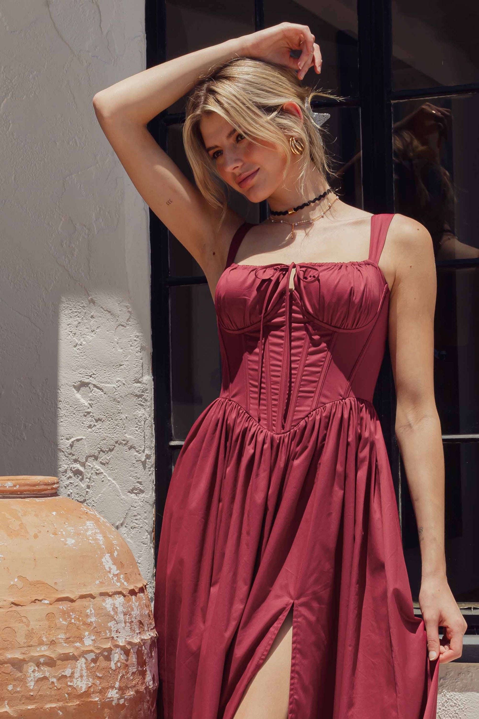 Stretch Poplin Corset A-Line Maxi Slit Dress -Full Maxi Length -Corset Body -Open Front Tie -Ruffle Detail -Front Slit -Fitted & Flowy -Back Zipper -Lined