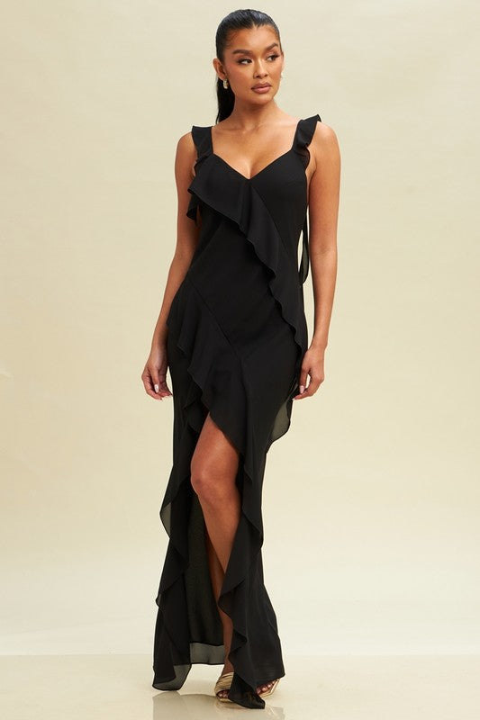 Elevate your style with the Eliana Dress, a long dress adorned with a stunning slit and ruffles. This dress is both fashionable and functional, providing you with the perfect combination of comfort and sophistication. Its eye-catching design is sure to turn heads at any event.