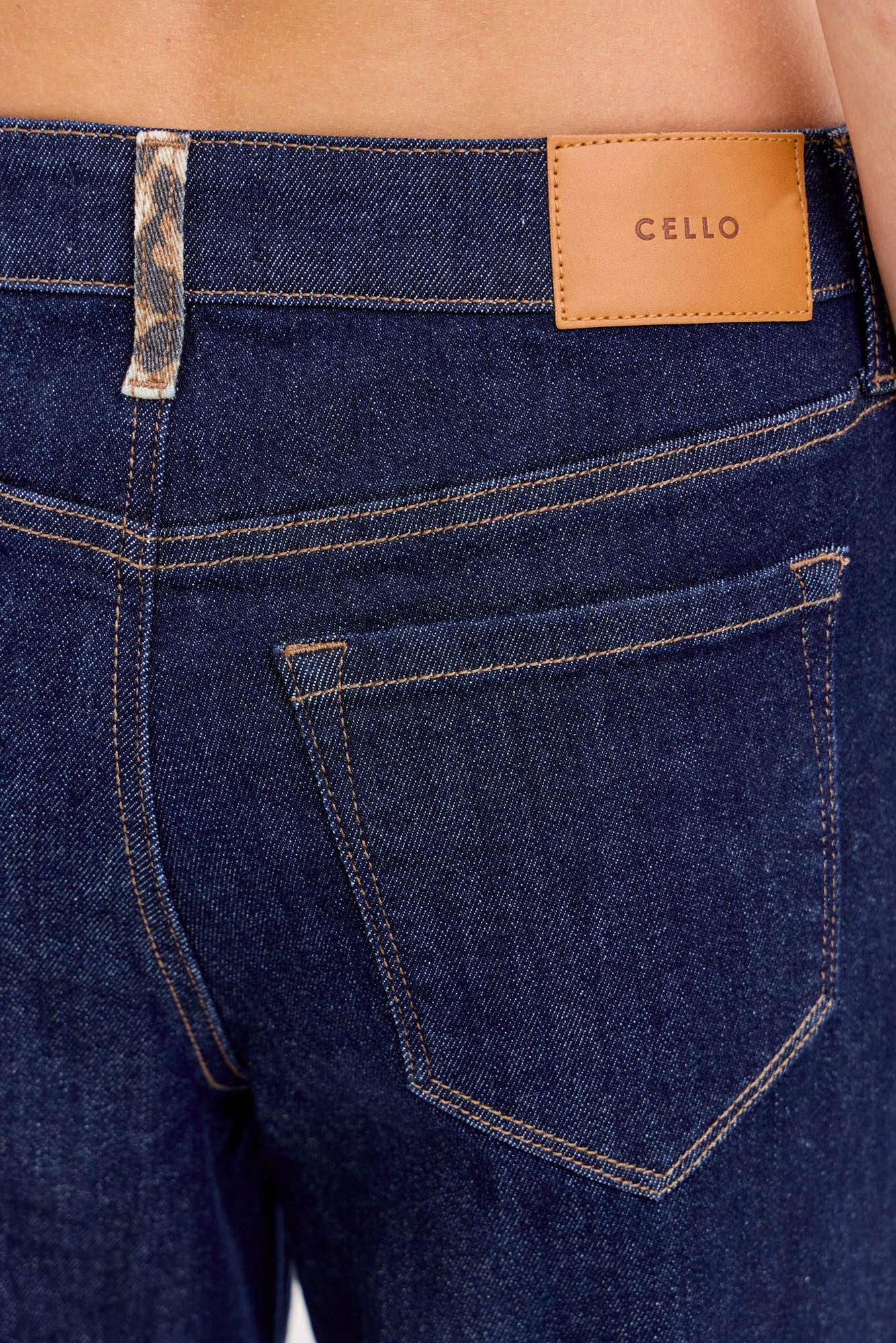 -Mid Rise Wide Leg -Dark Denim -Leopard Cuff -Belt Loops + Zip Fly -Front Rise 10", Inseam (Cuffed) 31"