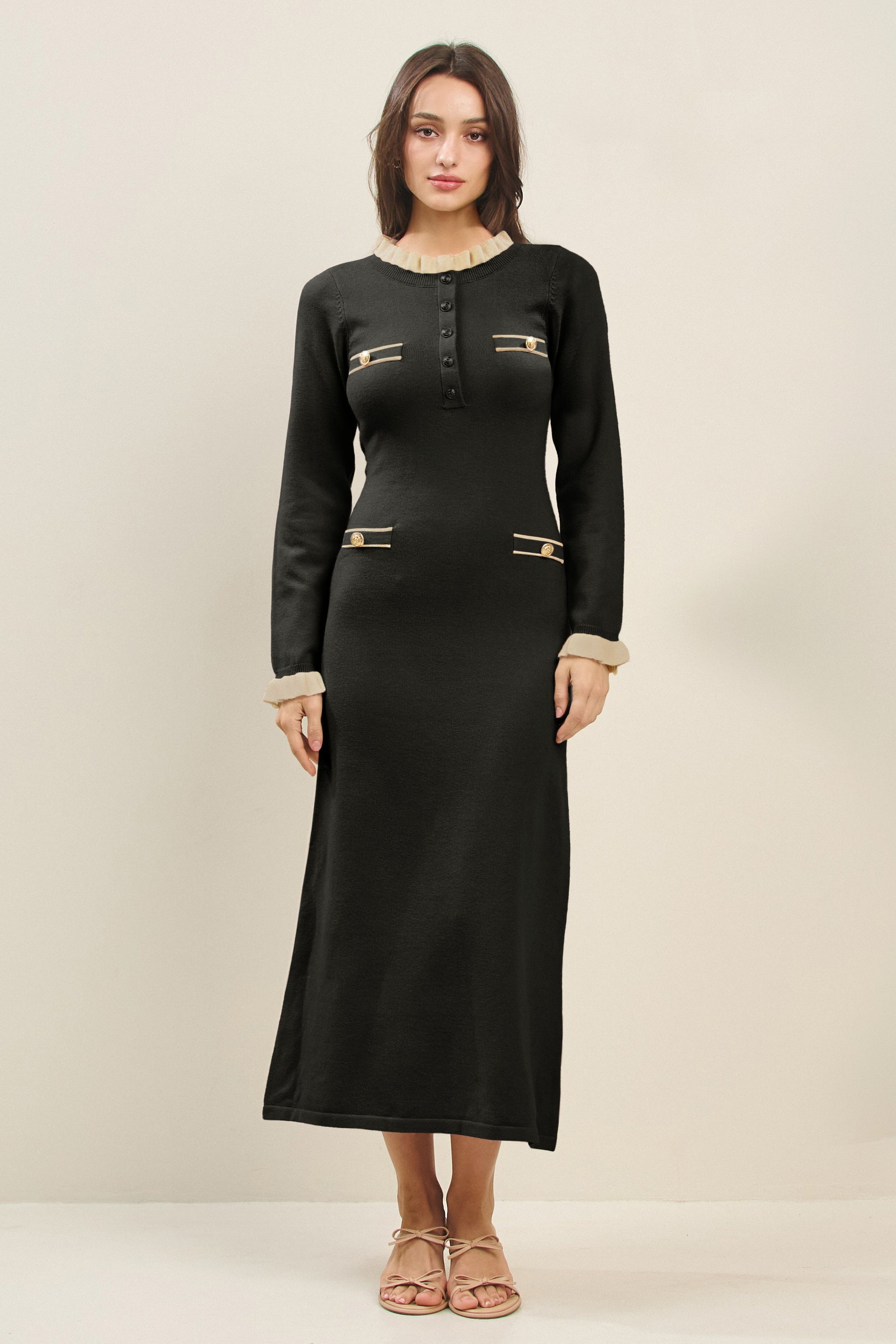 Contrast ruffle knit dress - Mockneck sweater maxi dress - Ruffle hem details